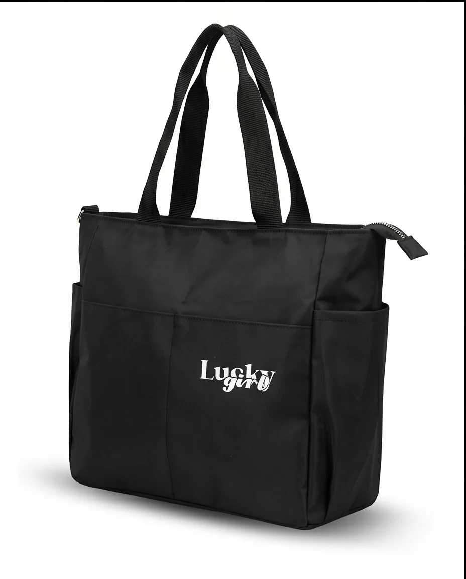 The rise of the 'manifestation' aesthetic has brought positive-messaging accessories to the forefront of streetwear. This bag perfectly captures that optimistic spirit, blending the utility of a classic oversized tote with the 'Lucky Girl' syndrome trend. Its sleek, nylon-like finish and minimalist black palette ensure it remains a versatile staple within the quiet luxury movement, prioritizing functionality without sacrificing a playful edge.