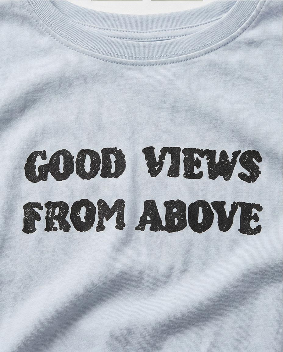 - Statement Typography: High-contrast "Good Views From Above" text in a textured, vintage-inspired font on both the front and back.