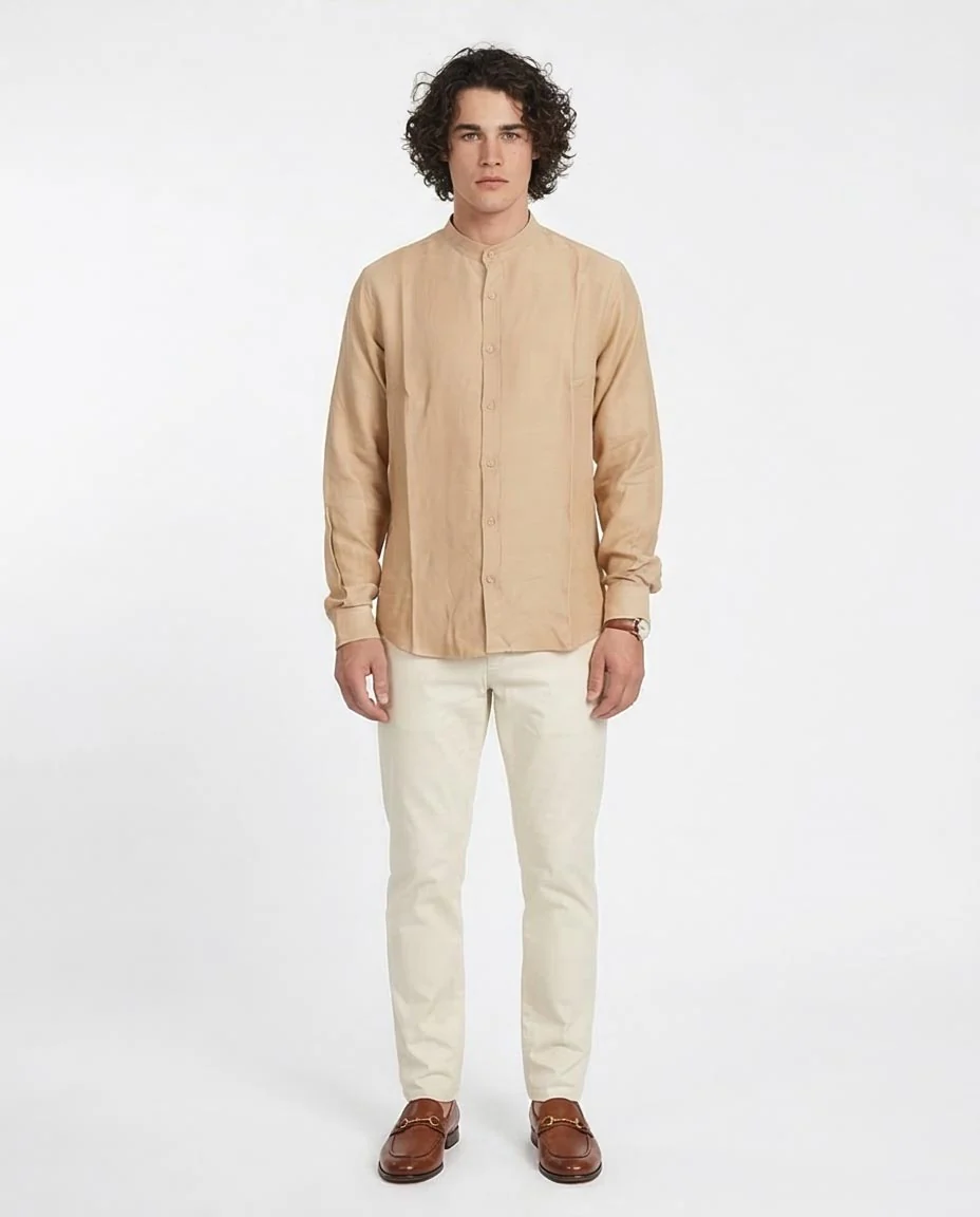 Ravin Men’s Mandarin Collar Linen-Textured Shirt – Sand - O203314