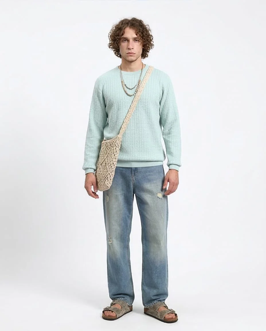 Elevate your seasonal essentials with the Ravin Textured Waffle-Knit Sweater. Designed for the modern man who values both comfort and a clean aesthetic, this sweater features a sophisticated grid-patterned waffle knit that adds depth and character to your look. The soothing aqua hue offers a fresh alternative to traditional neutrals, making it a versatile piece for transitional weather. Crafted with a relaxed fit and premium ribbing at the neckline, cuffs, and hem, this piece ensures a sharp silhouette that doesn't compromise on movement. Whether you�re layering it for a "Modern Boho" vibe with relaxed denim or keeping it classic for the office, this knit is built for effortless style. Product Features: Signature Texture: All-over heavy-gauge waffle/grid knit for a premium tactile feel. Superior Fit: Classic crew neck with reinforced ribbed detailing to maintain shape. Breathable Comfort: Soft, high-quality fabric designed for all-day wear. Versatile Styling: The vibrant yet muted aqua tone pairs perfectly with light-wash jeans, chinos, or layered outerwear.