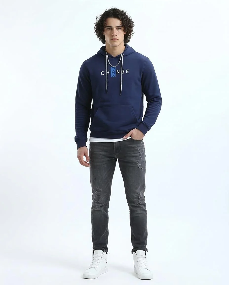 Designed for the modern urban explorer, this hoodie blends superior comfort with a bold, contemporary message. Crafted from a high-quality cotton-rich blend, it offers a soft-touch feel and a structured fit that holds its shape wash after wash. The deep navy blue hue serves as the perfect canvas for the architectural "CHANGE" chest graphic, making it an effortless centerpiece for your off-duty wardrobe.