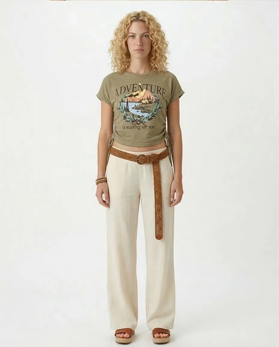 Ravin Adventure Series: Ruched Side Graphic Tee-Khaki - O182845