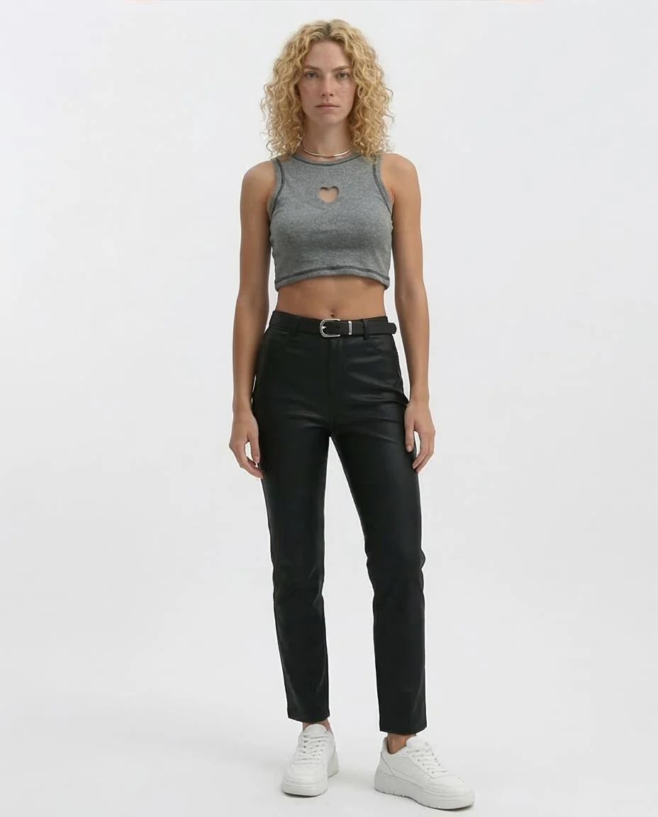 Turn heads with a touch of shimmer and a bold silhouette. The Ravin Heart-Cutout Ribbed Crop Tank is designed for the woman who bridges the gap between edgy streetwear and feminine flair. Crafted from a premium heather grey ribbed fabric with a subtle metallic finish, this top offers a high-shine energy that transitions effortlessly from day to night.