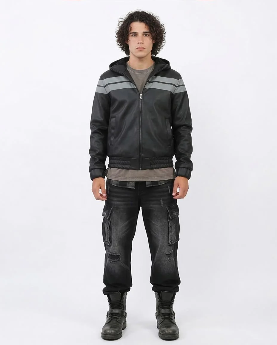 Designed for the modern urbanite, this Ravin hooded bomber jacket merges the rebellious spirit of a biker jacket with the cozy comfort of your favorite hoodie. Crafted from premium, matte-finish faux leather, it features a distinctive dual-stripe racing motif across the chest and back for a bold, athletic edge.