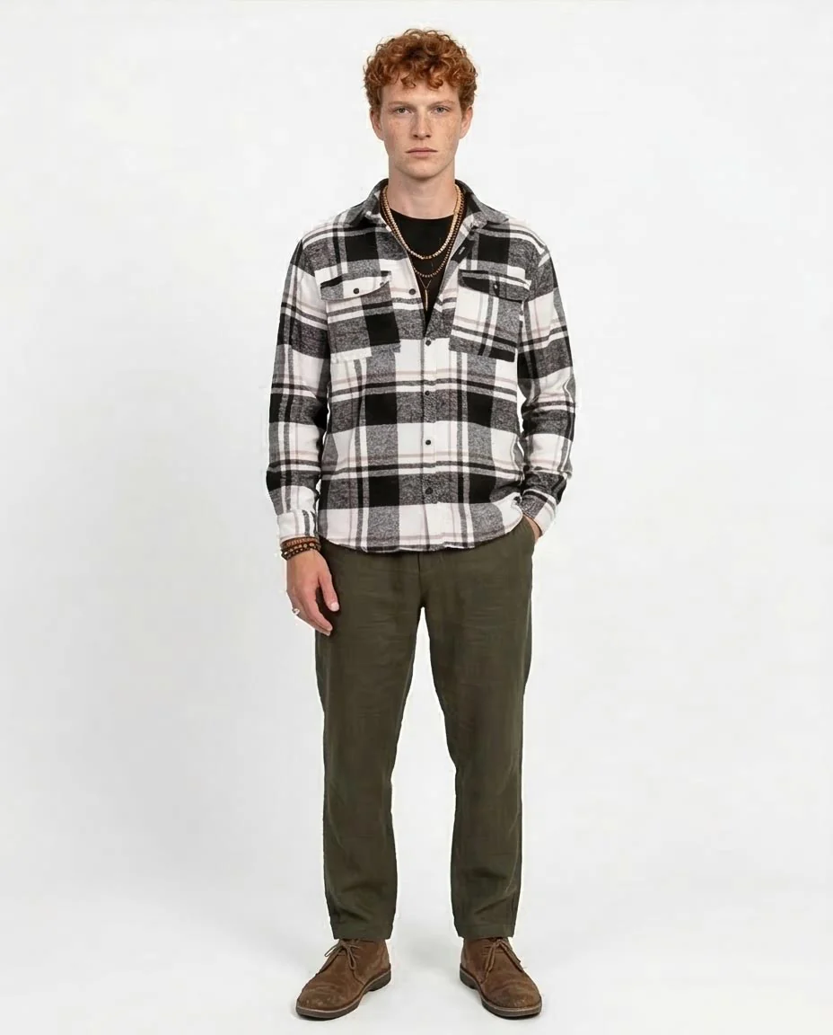 Design & Fabrication Crafted from a premium, heavyweight brushed fabric, this shirt offers a soft-to-the-touch feel with maximum heat retention. The classic black and white buffalo check is reimagined with subtle tan pinstripe accents, adding a unique depth that pairs effortlessly with earth tones and denim alike.