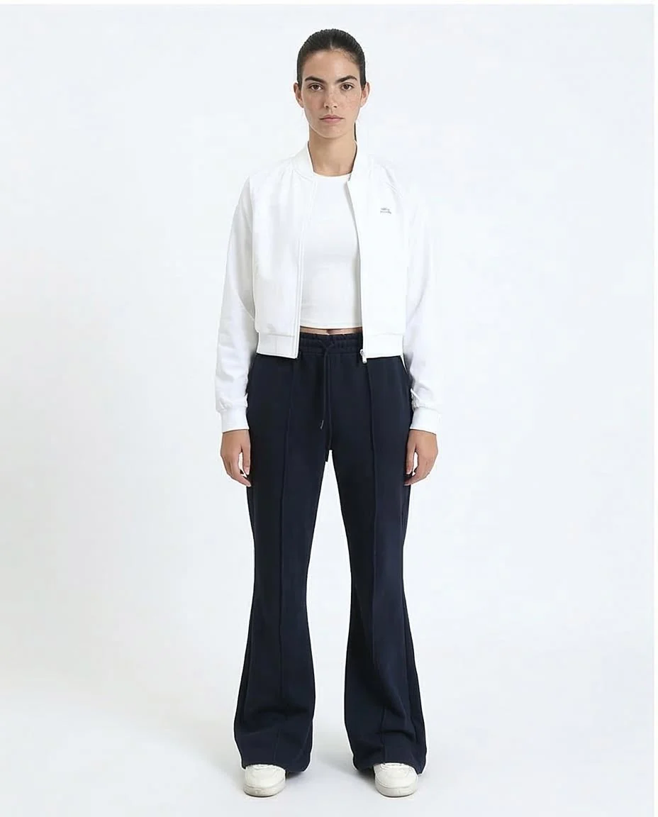 Elevate your off-duty wardrobe with the Ravin Pintuck Flared Sweatpants. Designed to bridge the gap between cozy loungewear and high-fashion streetwear, these sweatpants offer a sophisticated take on the classic jogger. Crafted from a premium heavyweight cotton-blend, these pants feature a structured yet soft drape that holds its shape throughout the day. The vertical pintuck seam running down the center of each leg adds a tailored touch, elongating the silhouette and providing a polished look that transitions easily from the sofa to the city. The slim fit through the thigh flows into a dramatic flared hem, perfectly balanced by a comfortable elasticated waistband and matching navy drawstrings. Functional side-seam pockets ensure utility without compromising the sleek, streamlined aesthetic.