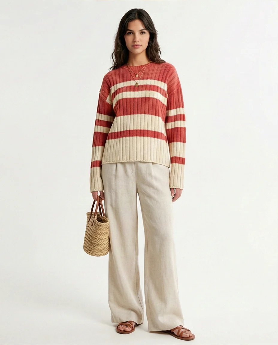 Ribbed Crew Neck Striped Pullover - Watermelon & White - R215287
