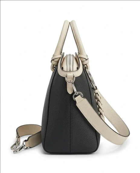 In an era of quiet luxury, this handbag stands out through its sophisticated minimalism. The contrast between deep charcoal and soft cream creates a striking visual balance that complements any palette. Its pebbled texture and artisanal braided charm tap into the current trend of tactile, elevated basics that feel as good as they look.