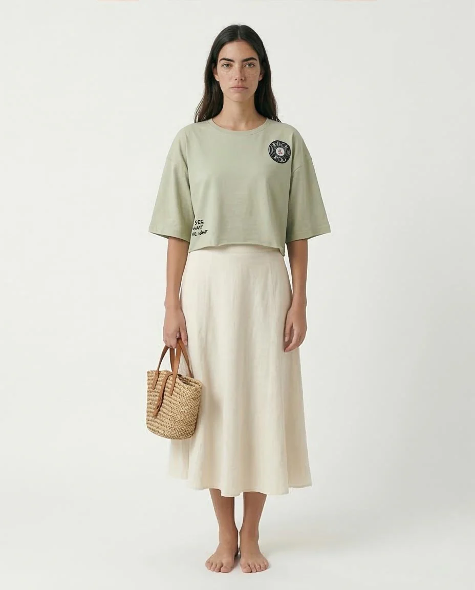 - Neckline: Classic ribbed crew neck that holds its shape. Styling Tip Go for a Modern Boho vibe by pairing this tee with a high-waisted linen midi skirt and woven accessories, or keep it classic with distressed light-wash denim and chunky sneakers.